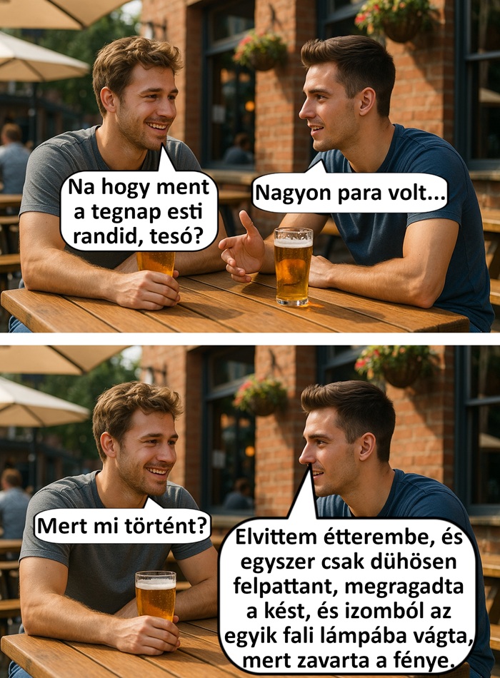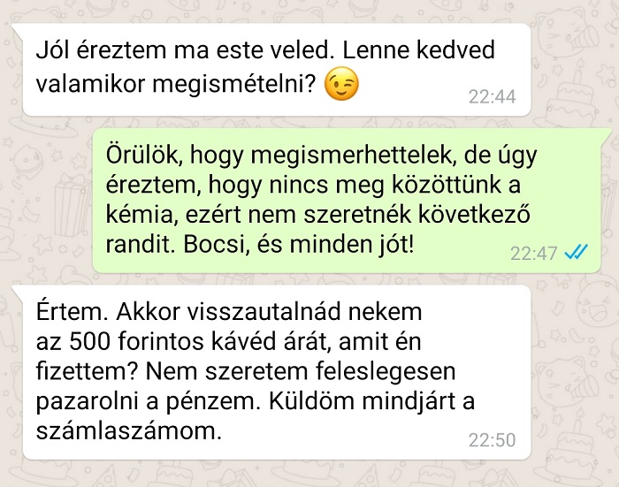 7. Ő rendelt egy 15 ezres steaket és koktélokat, én egy salátát és vizet. A számlánál komoly arccal kijelentette: „Szerintem felezzük meg.”