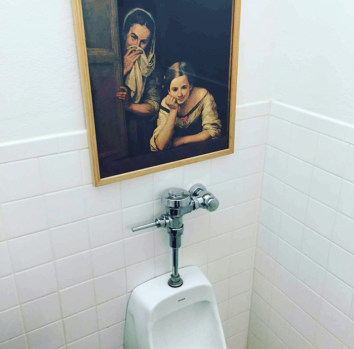 14. Az egyik kolléga egy festményt akasztott ki a férfi mosdóban, pont a piszoár fölé.