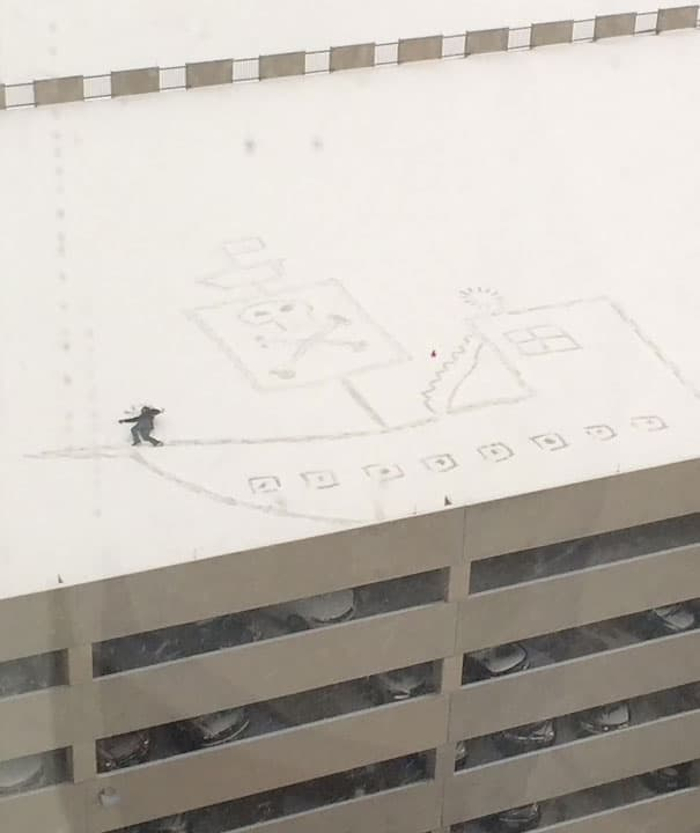 5. Amikor leesett az első hó, egy kollégánk felment a szomszéd parkolóház tetejére, és alkotott valamit, amit az egész iroda megtapsolt az ablakból.