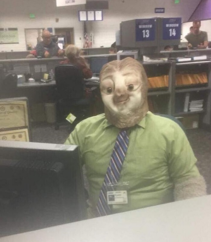 13. A barátom egy ügyfélszolgálaton dolgozik, ahol sok türelmetlen ügyféllel van dolguk. Hogy oldja a hangulatot, egyik nap a Zootropolis című animációs filmben szereplő lajhárnak öltözve ment be dolgozni.