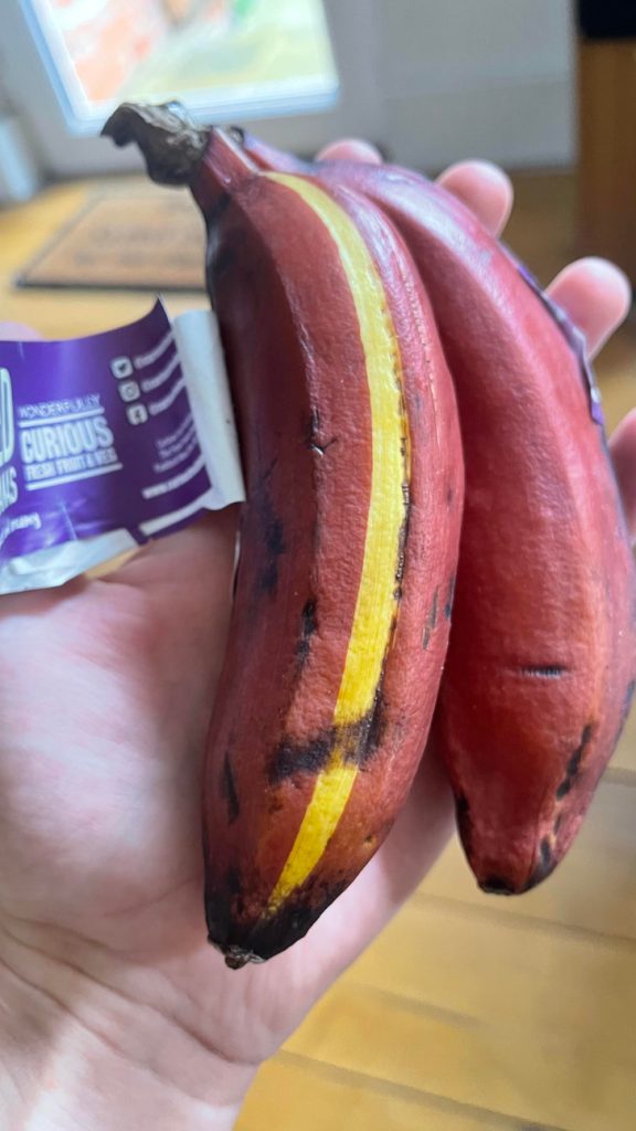 Piros banán, sárga csíkkal.