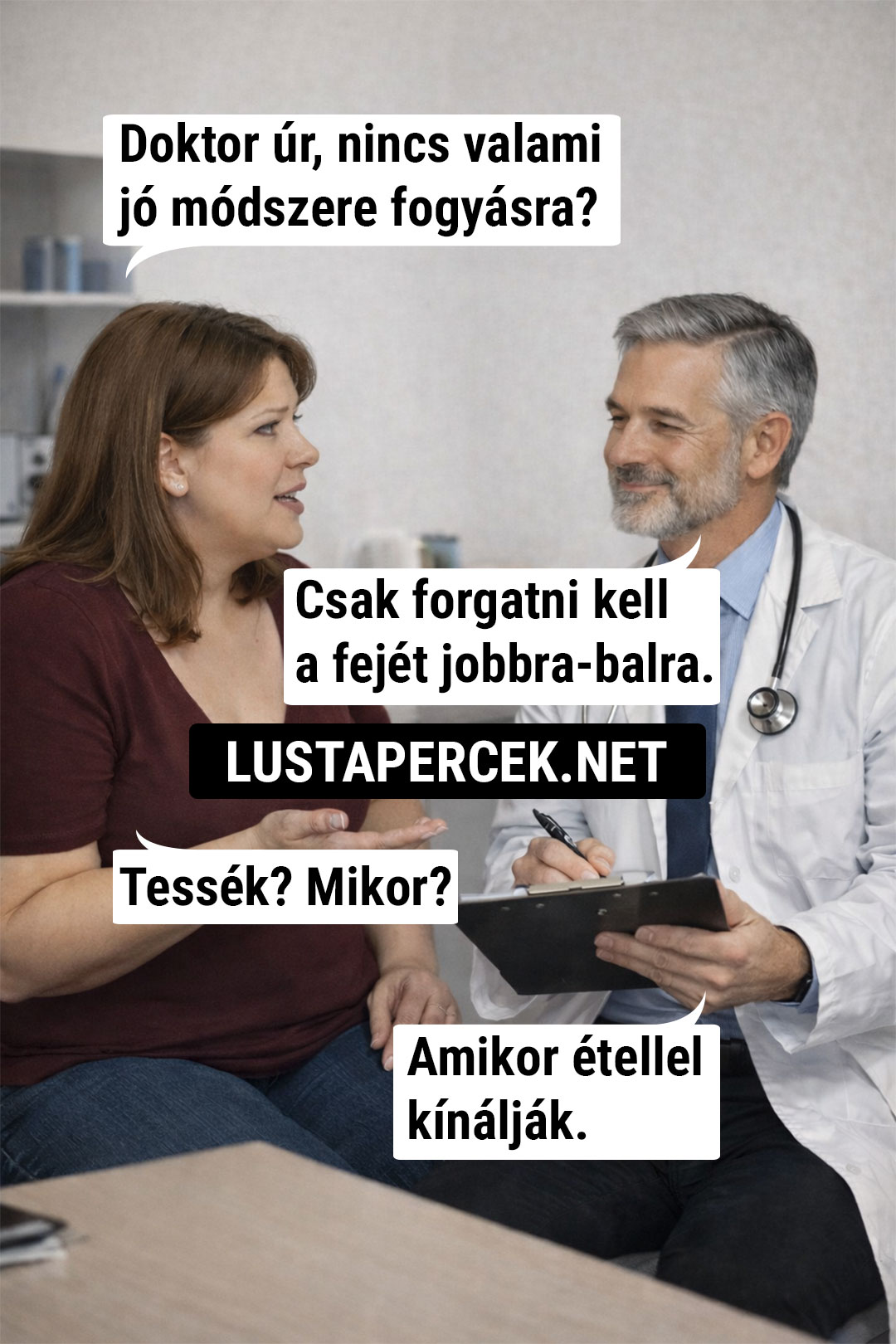 – Nézze, uram, őszinte leszek: legalább húsz kilót le kell fogynia – mondja komoly hangon. – Kímélő étrendet javaslok. Egyen kevés gyümölcsöt, párolt zöldségeket, salátát, és legfeljebb egy szelet pirítós kenyeret.