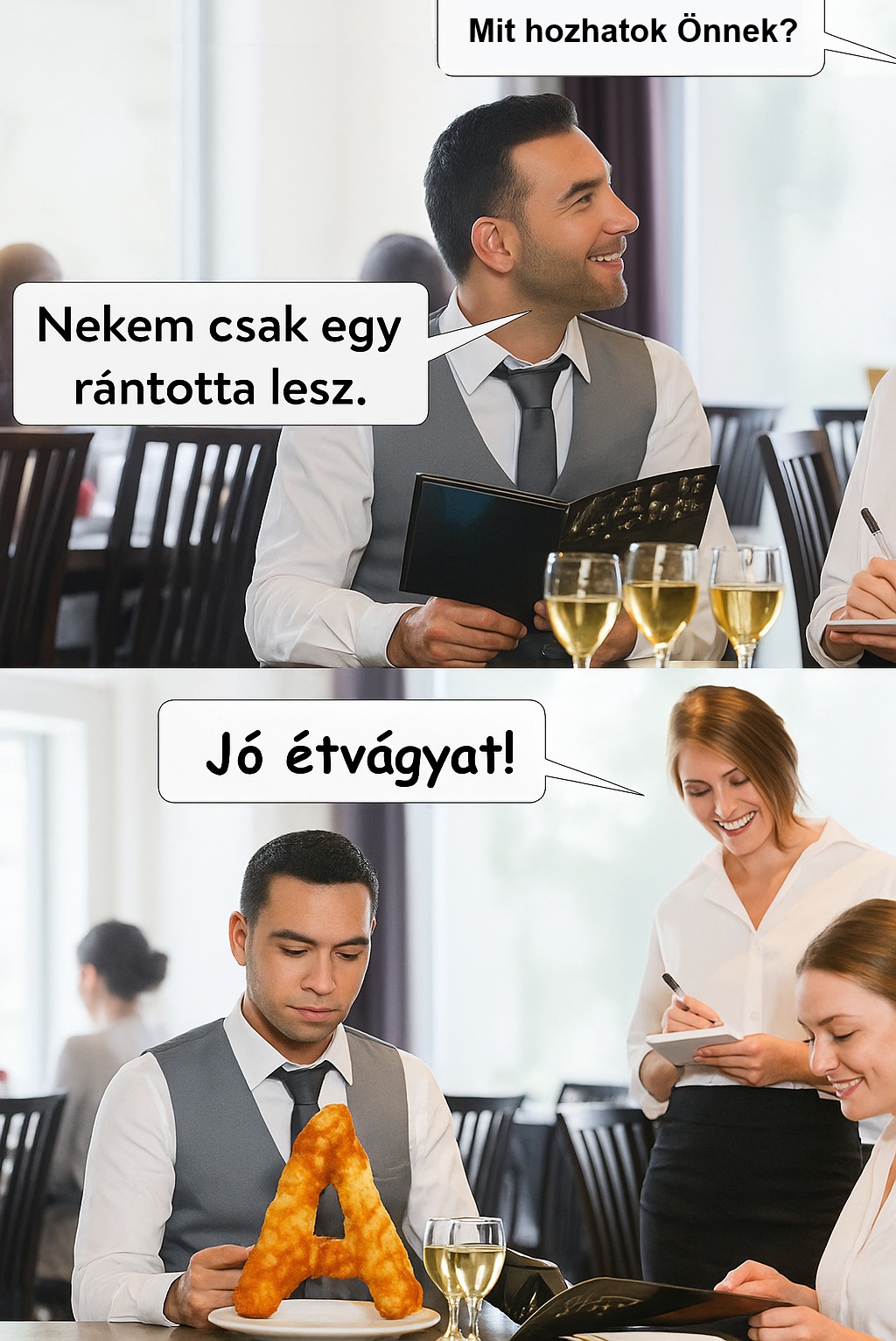 – Ó, ez nagyszerű! Akkor kérek kettőt cukorral, egyet cukor nélkül, egyet tejszínnel és két capuccinot!